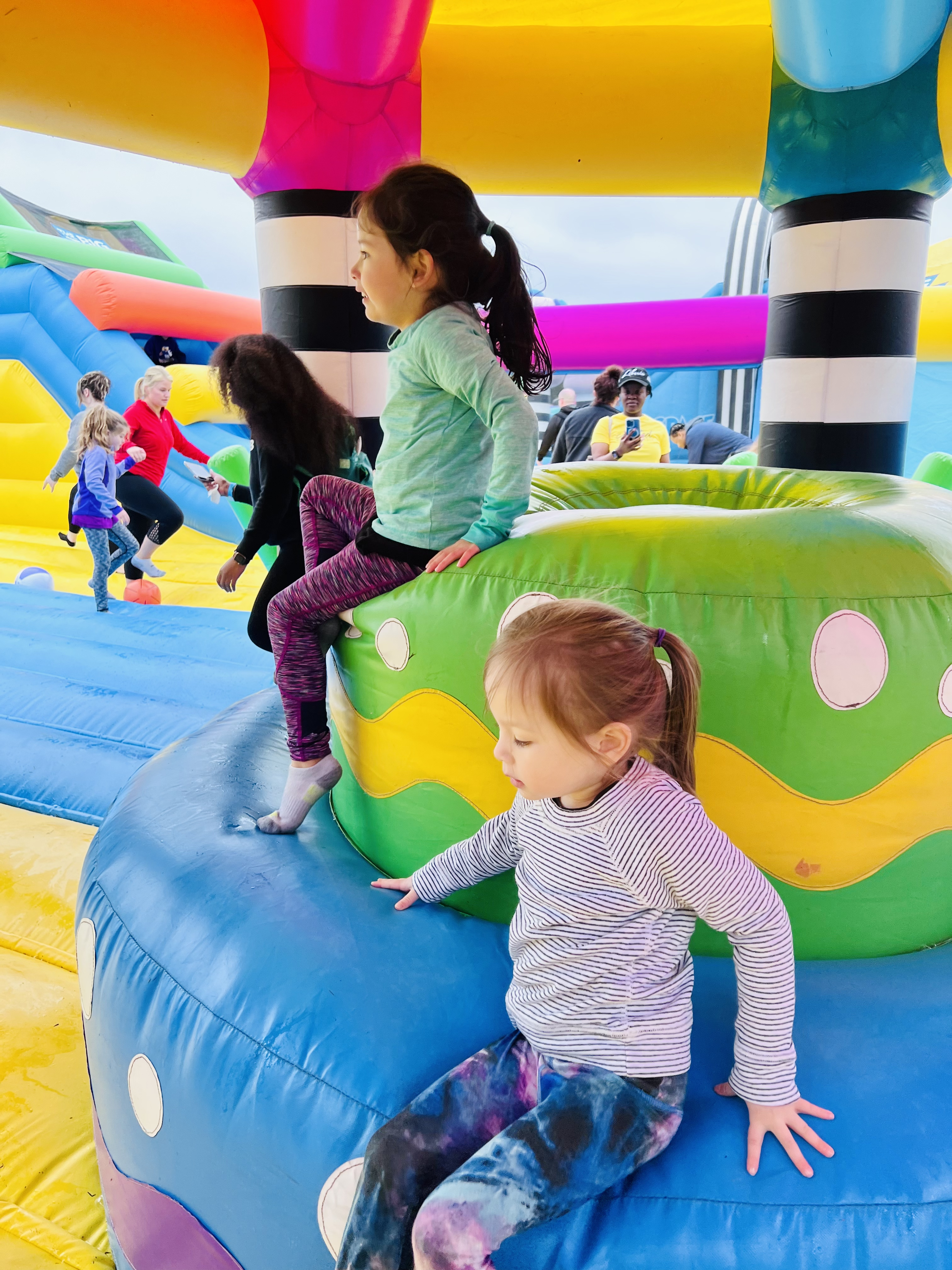 Our kids (almost 6 and 5) were super excited to go. There were six smaller bounce houses (obstacle course, giant slides, a sports house with climbing walls, basketball, wrecking balls, etc) in addition to The World’s Biggest Bounce House. This main house had multiple “rooms” and activities, plus slides and a DJ booth. Our kids attacked this thing. My twins ran from room to room for about 45 minutes straight. They didn’t mind falling or the density all of the other kids and adults.