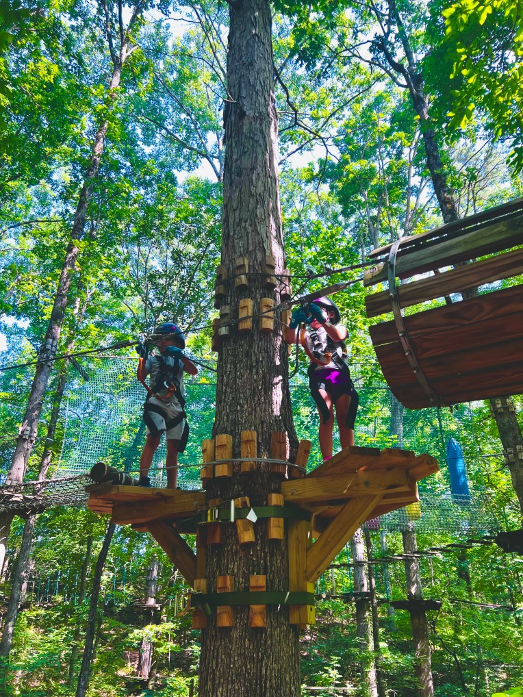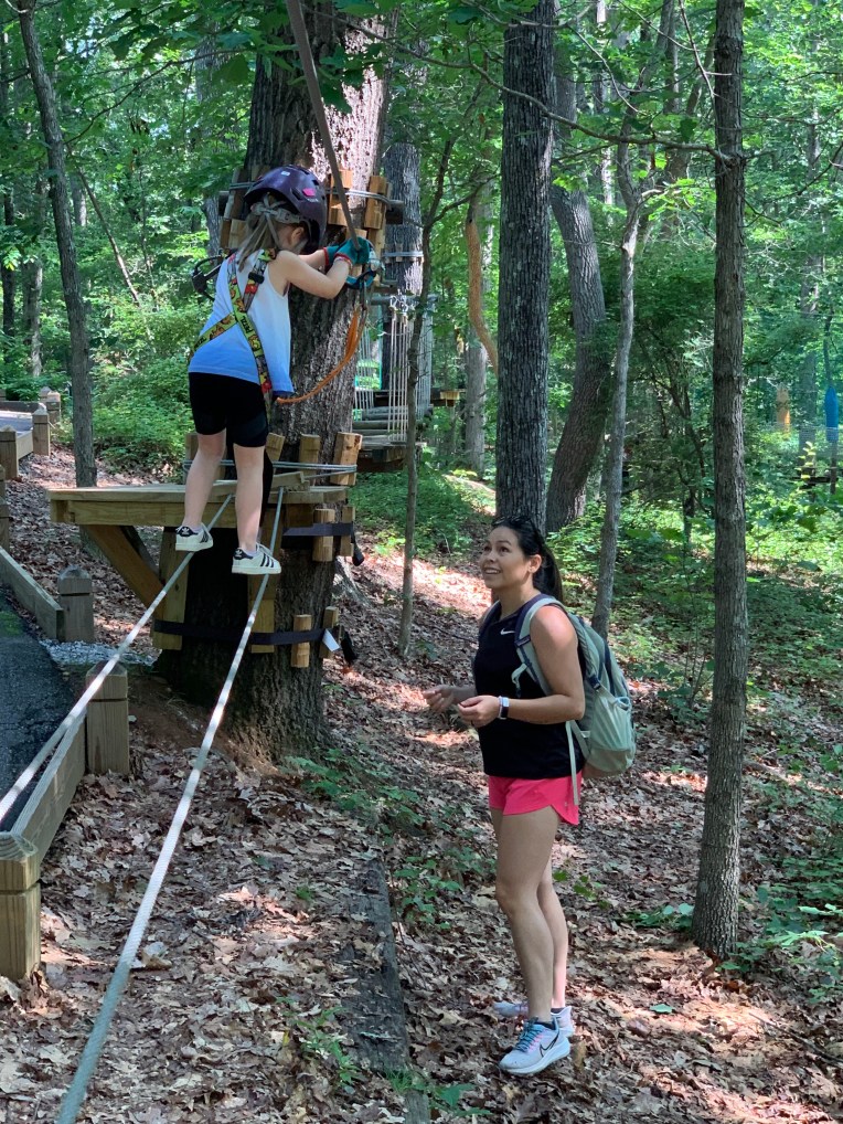 By the second part of the course, they were on higher platforms. At one junction, Z couldn’t get her clip through a connector and she was about 15 feet above us. We couldn’t help her with her gear, but her sister and friend could. So the three of them were able to work together and continue to the end.