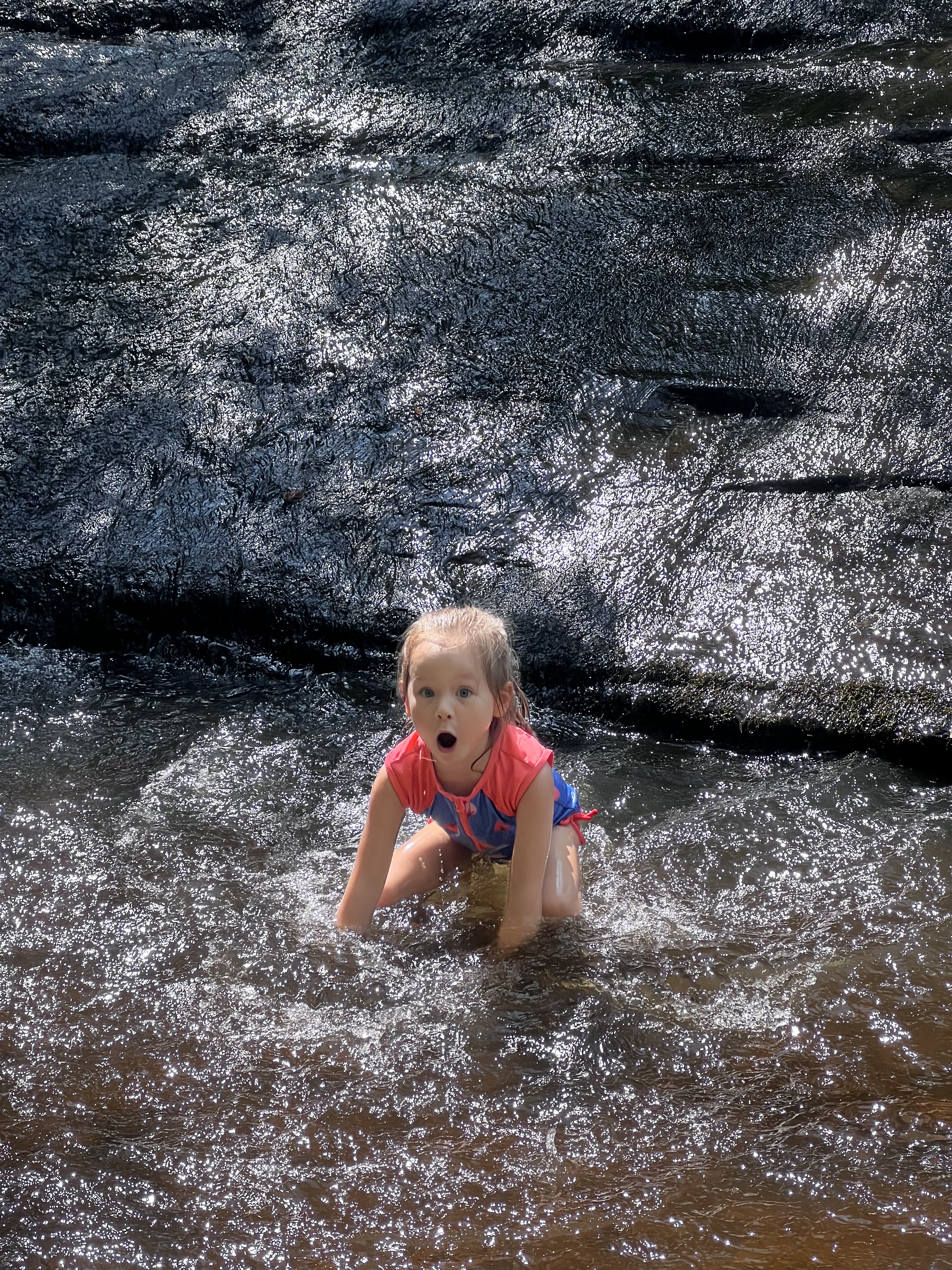 The kids played for about 15 minutes on the top ridge. There are wider rocks where you can just sit and enjoy the current and some shallower pools to dip your feet. These all had a bit of green algae and mud, so footing was never really certain. And then, when scooting across a rock, Aeris lost her footing and slide about five feet down the middle rock slide. She scrambled a bit until she landed in a deeper pool about 3 feet deep. The swimming lessons paid off and she was able to get back to the surface, but she couldn’t get a good grip on the rocks to pull herself out of the water and it was too deep for her to stand up. So I went in after her.
