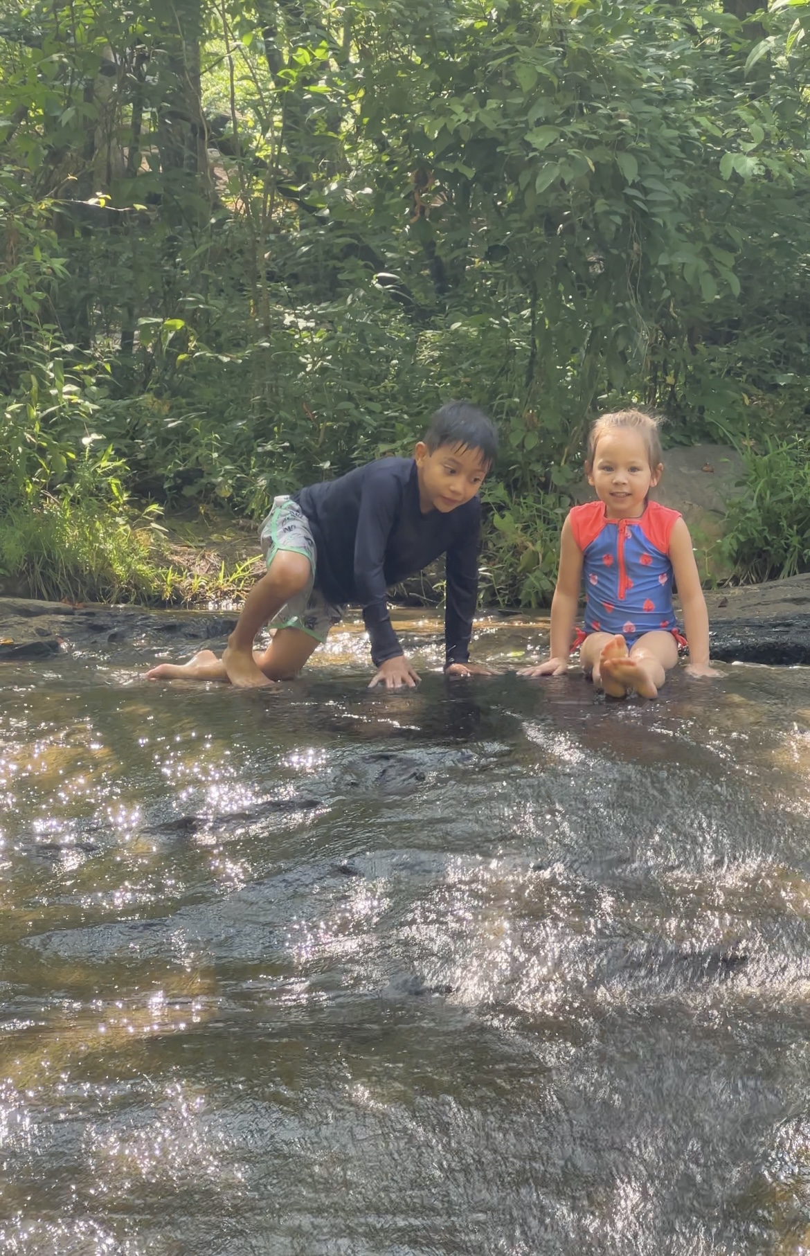 Right off the bat, we’re dealing with nature: mud, trees, bugs, unknowns. While I had seen other popular natural waterslides (Sliding Rock, Sedona), these were much shorter. The kids went back and forth on whether or not to keep water shoes on or go barefoot. Neither really helped because these rocks were slippery. Even with the constant reminders of “Use your hands” or “Scoot on your butt”, there was a lot of slipping. I even ate it pretty hard when I was scoping out the faster water areas.